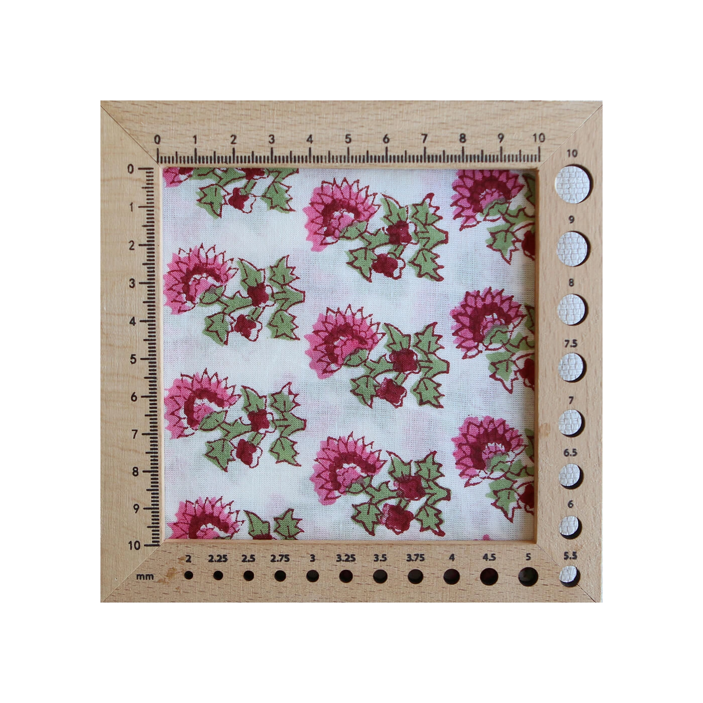 Les couleurs et les motifs apparaissent petit à petit en trempant le tampon en bois dans l'encre textile, puis en le frappant sur le tissu, répétant ce geste autant de fois que nécessaire pour remplir le coupon.