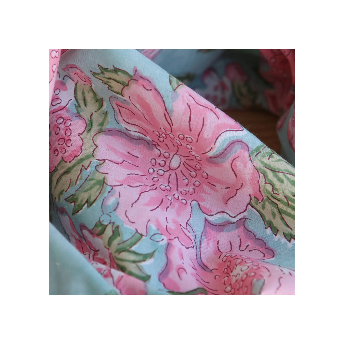 A noter que le processus artisanal (impression à la main, au tampon en bois) de ce tissu fait que chaque pièce est unique et que l'impression n'est pas aussi parfaite qu'un processus industriel.