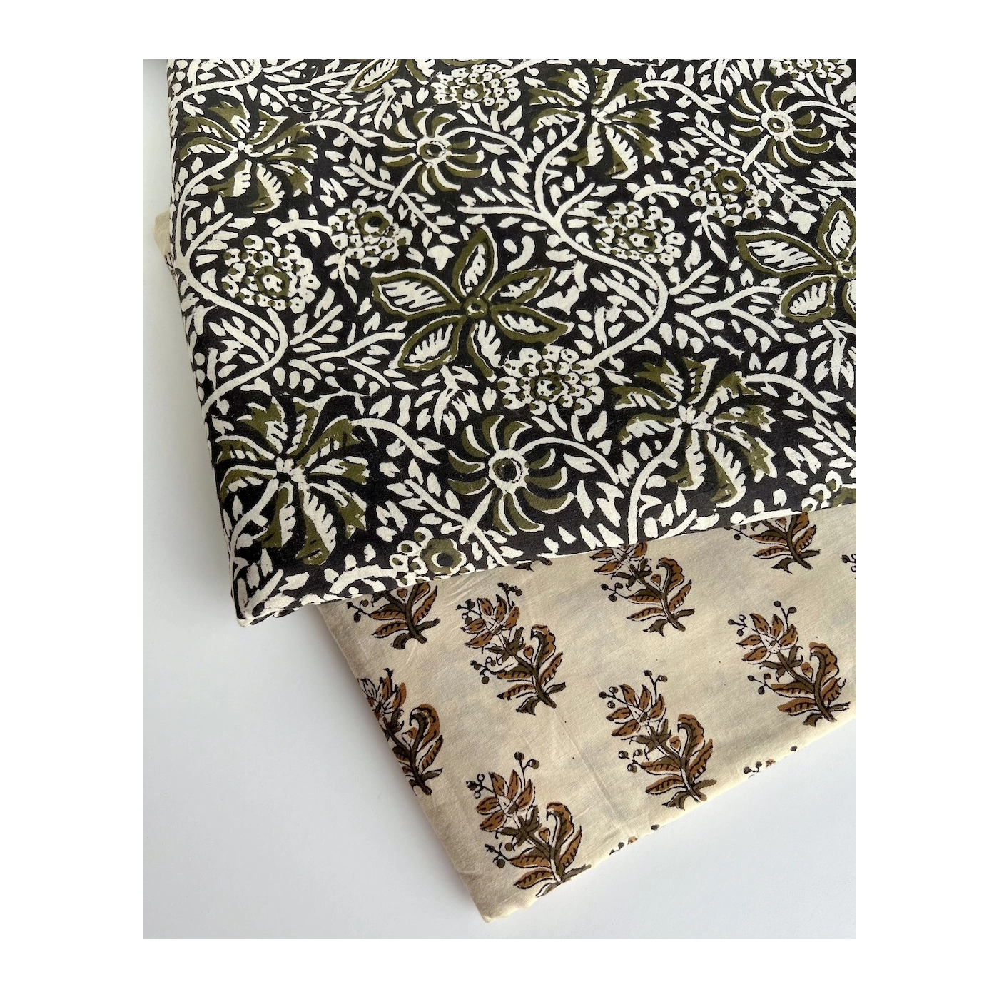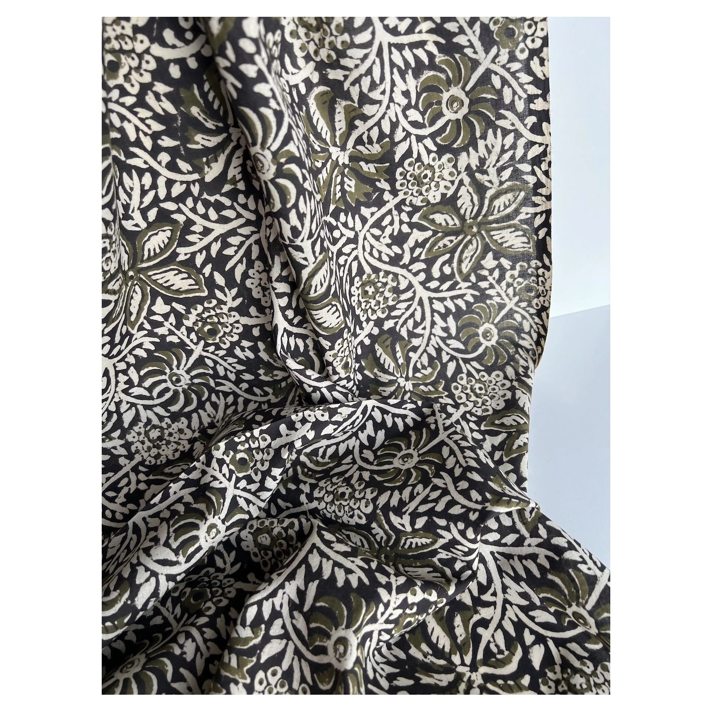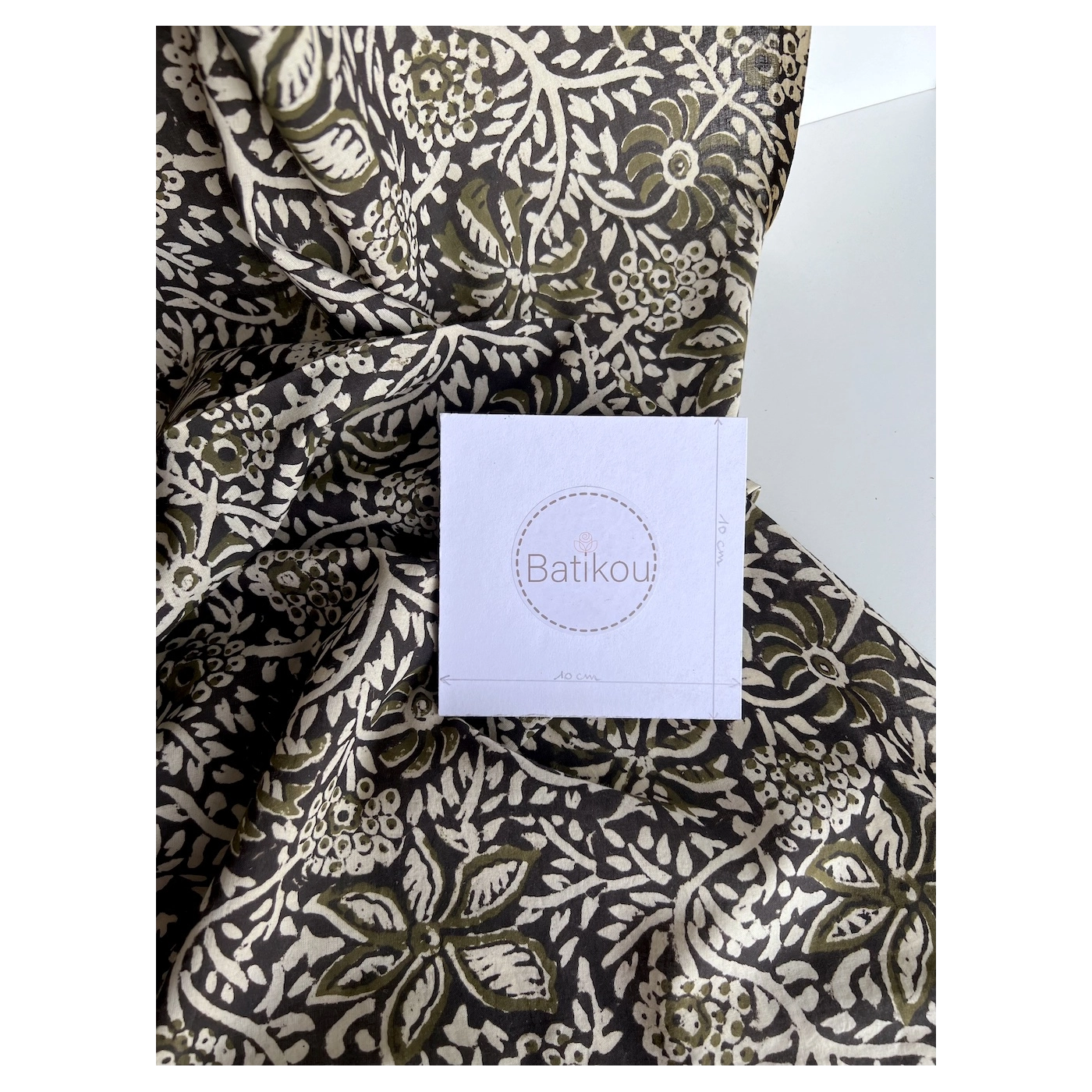 Tissu indien coton hand block traditionnel kaki / noir Batikou - 1