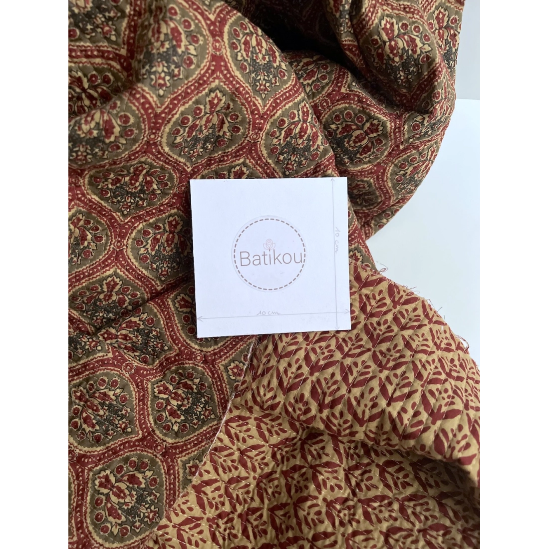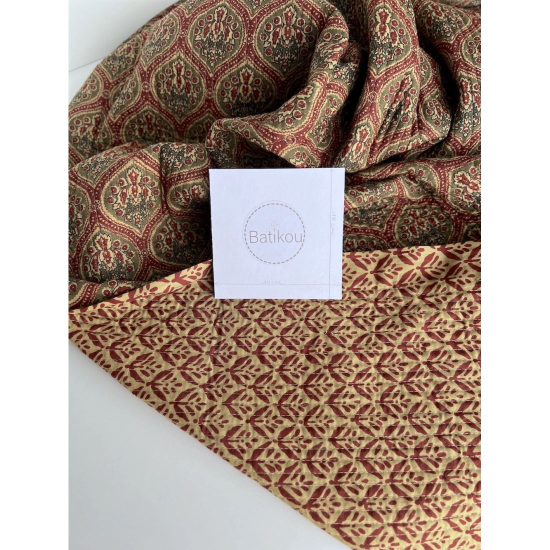 - A noter que le processus artisanal (impression à la main, au tampon en bois) de ce tissu fait que chaque pièce est unique et que l'impression ET le matelassage ne sont pas aussi parfaits qu'un processus industriel.