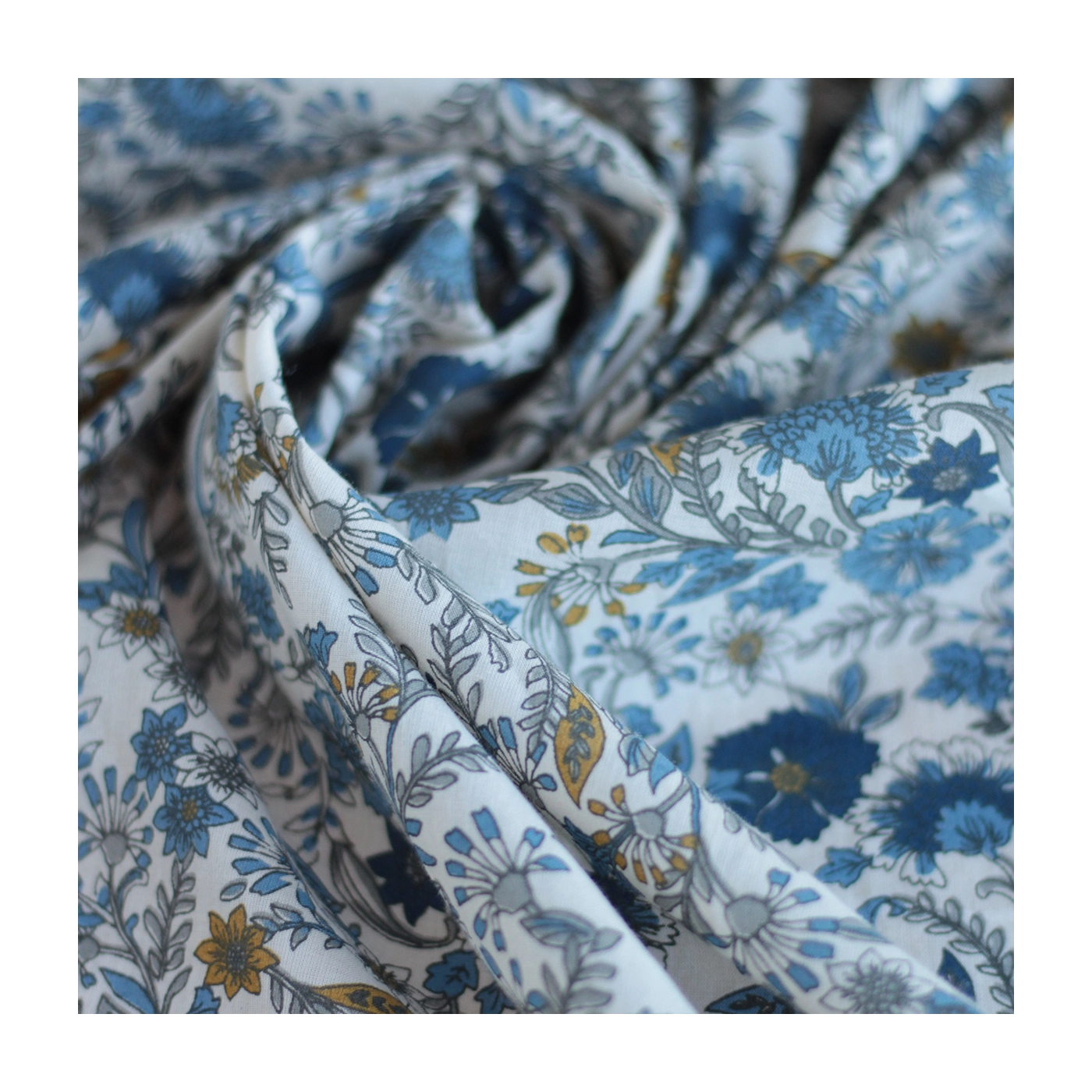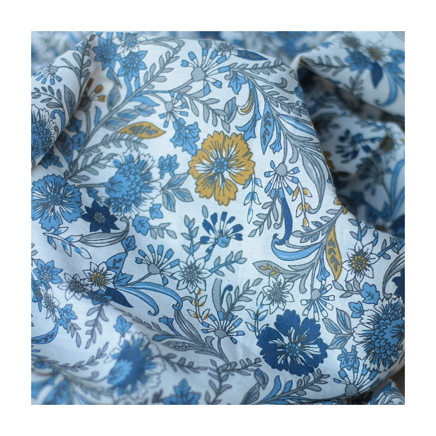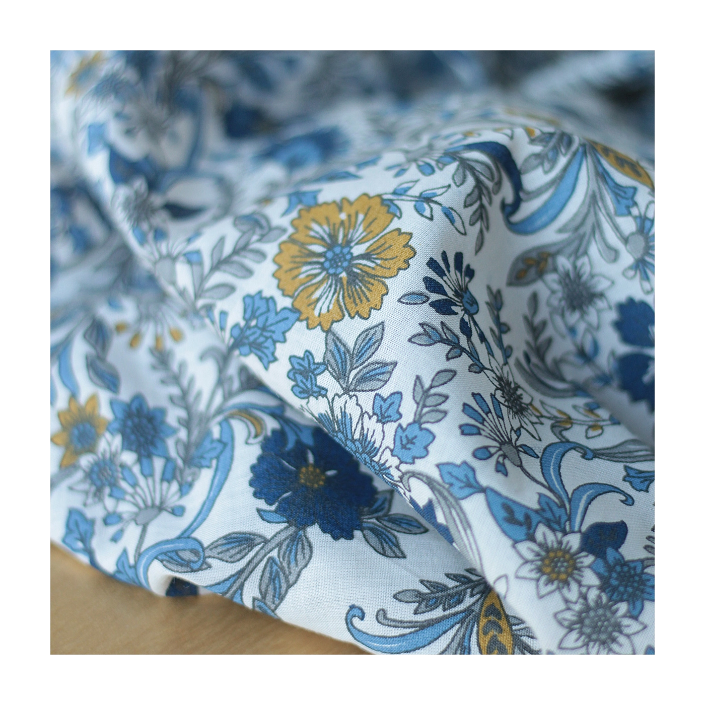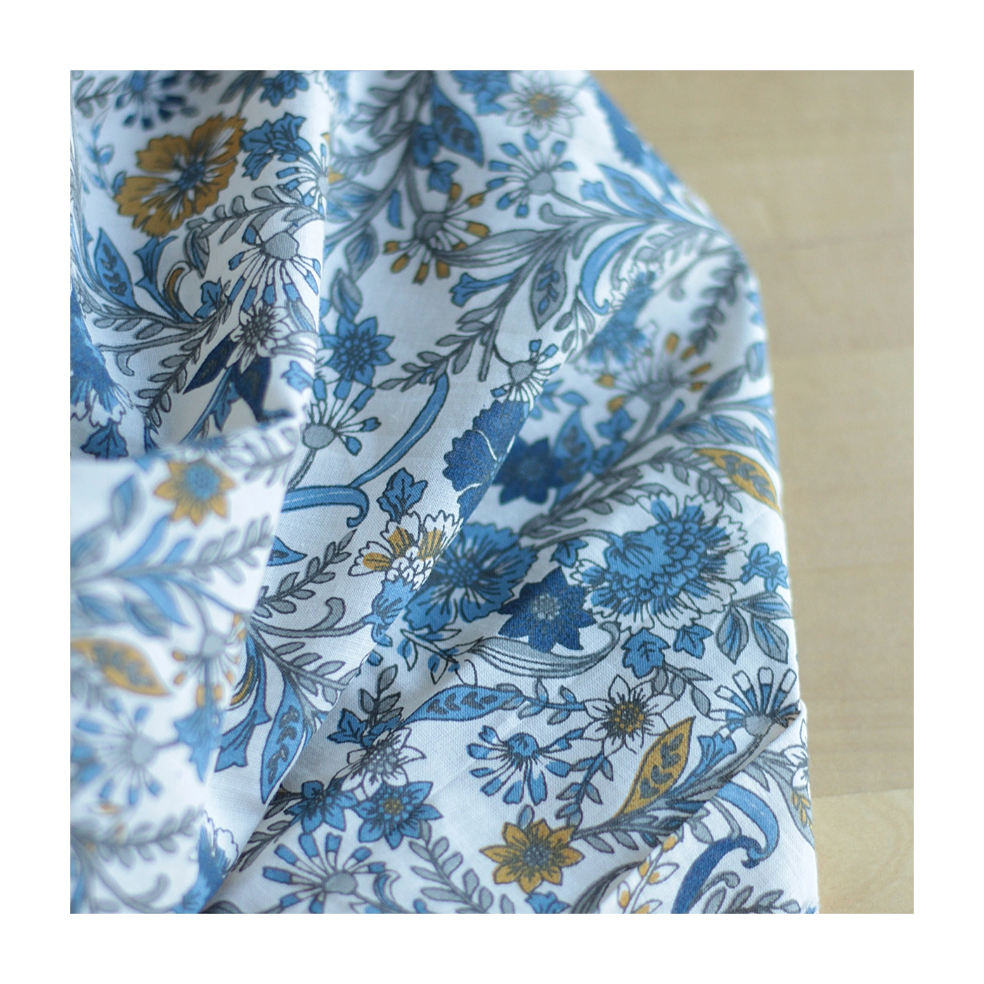 Tissu indien coton hand block traditionnel beige et bleu Batikou - 2