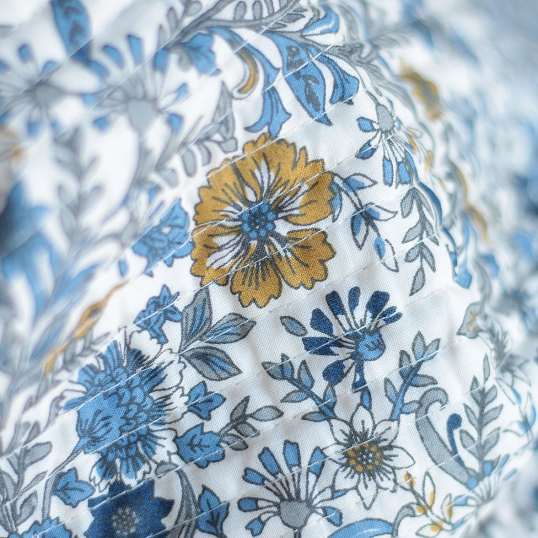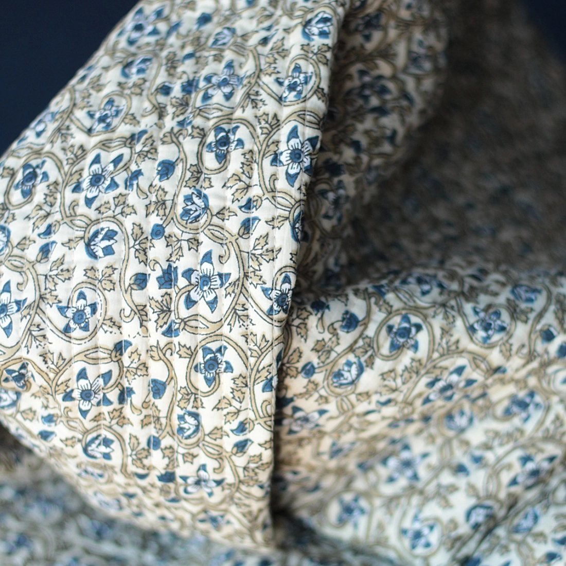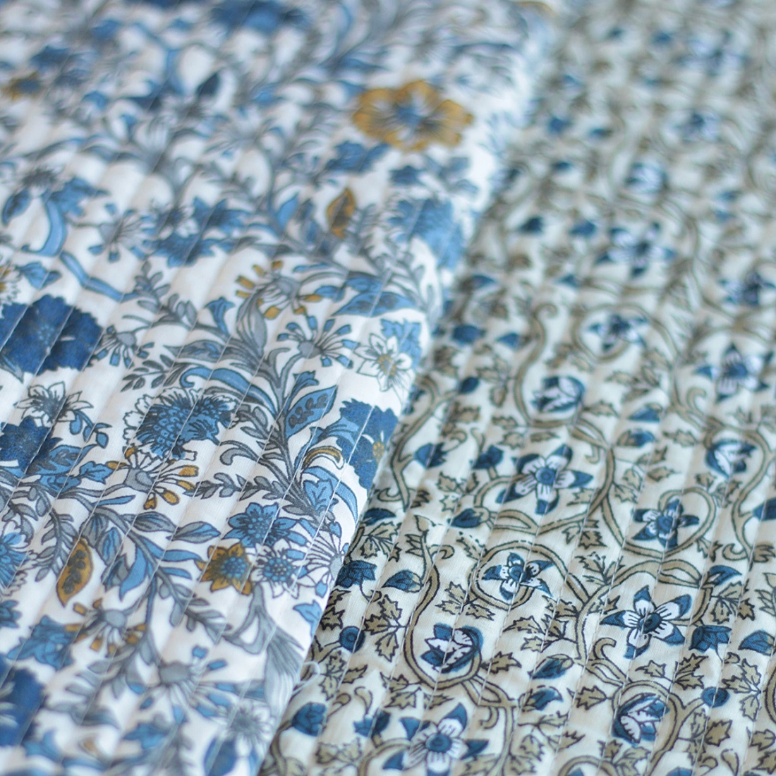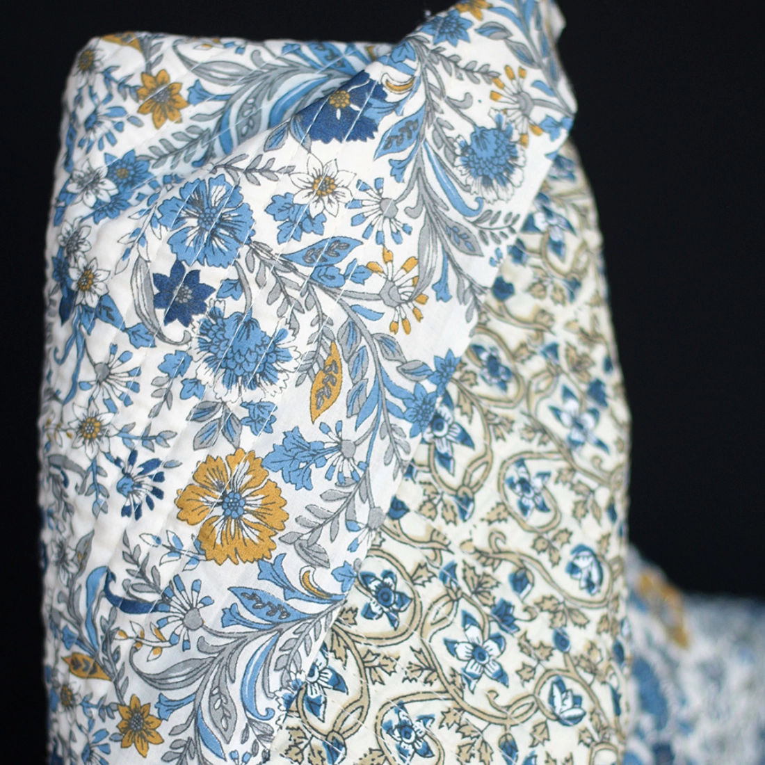 Nous avons décliné cette collection avec nos partenaires en Inde, afin de vous proposer pour le même motif le tissu en coton, et la version double face matelassée.