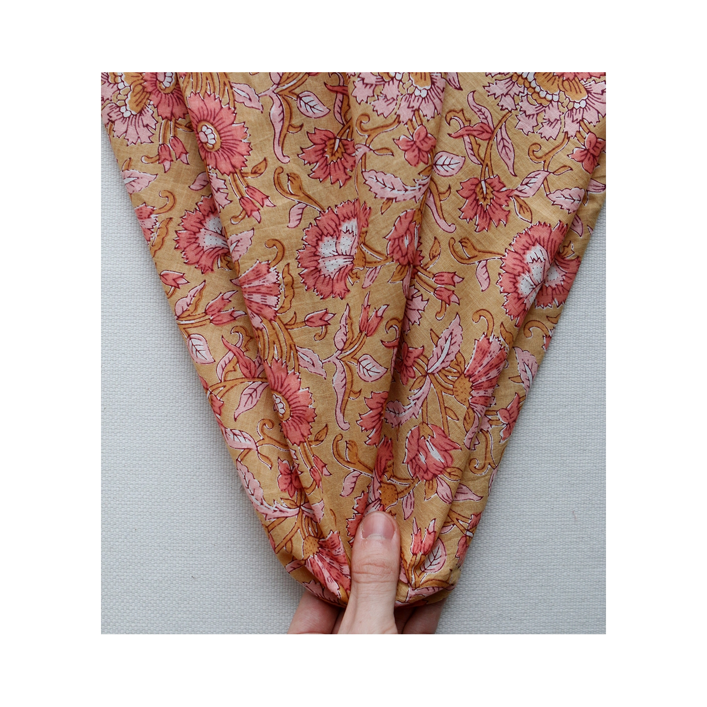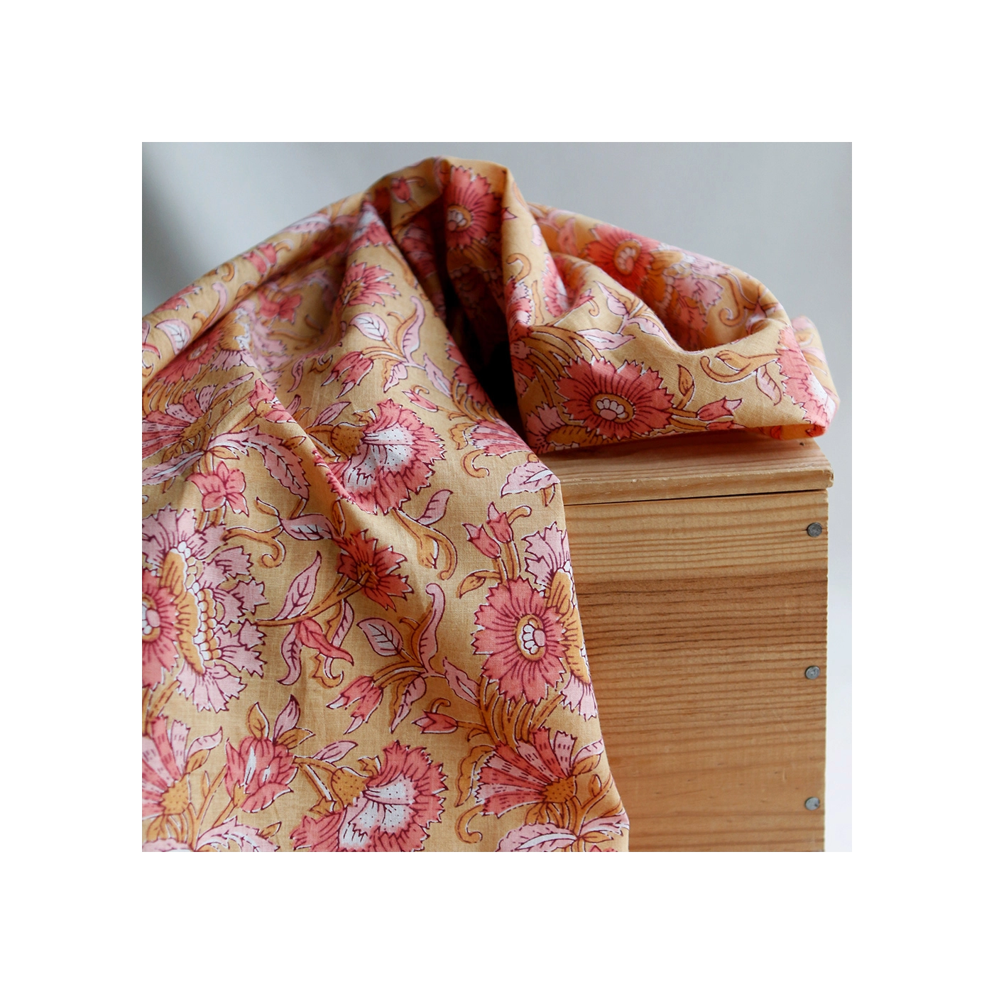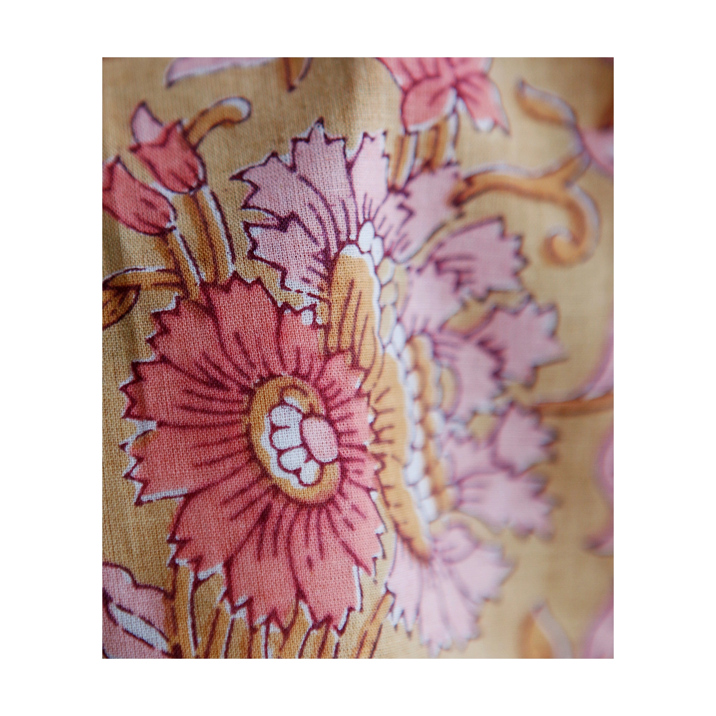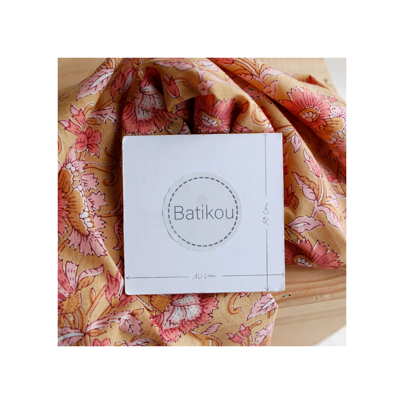 A noter que le processus artisanal (impression à la main, au tampon en bois) de ce tissu fait que chaque pièce est unique et que l'impression n'est pas aussi parfaite qu'un processus industriel.
