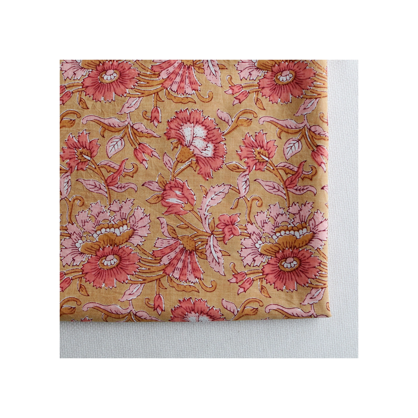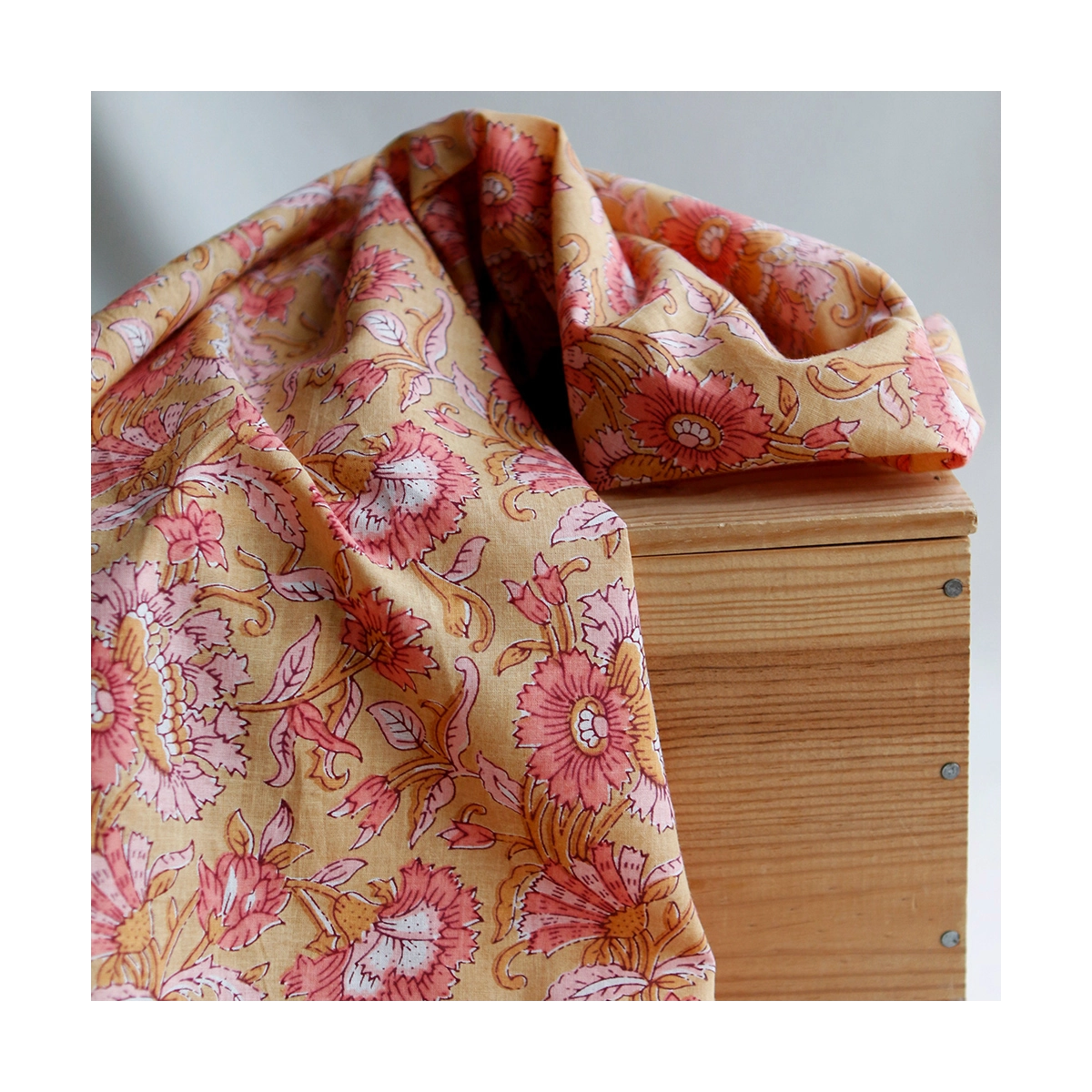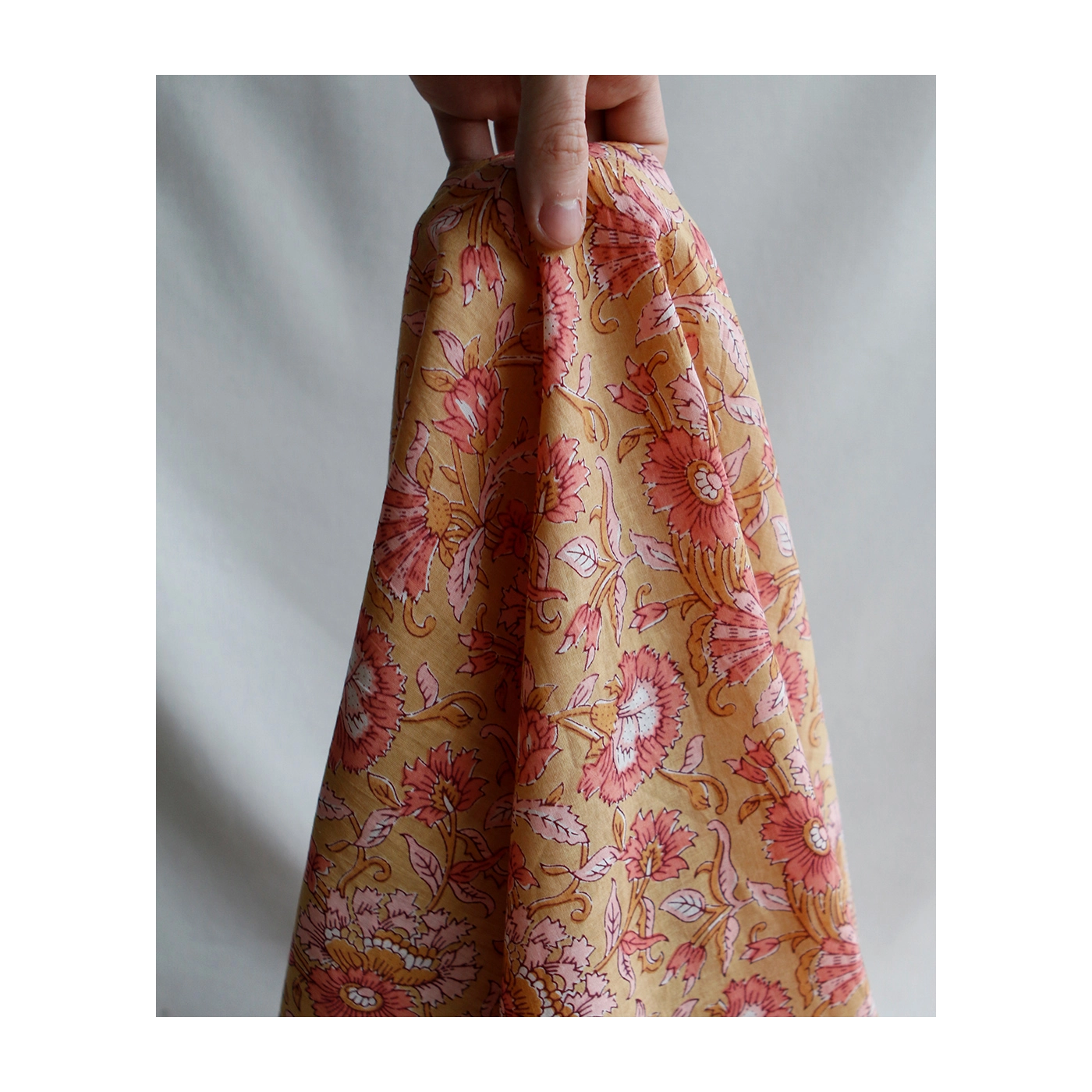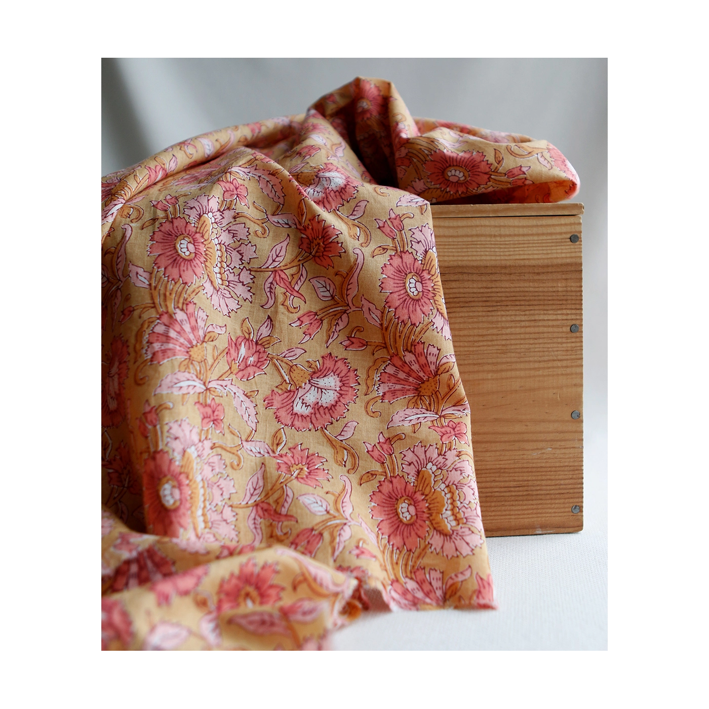 A noter que le processus artisanal (impression à la main, au tampon en bois) de ce tissu fait que chaque pièce est unique et que l'impression n'est pas aussi parfaite qu'un processus industriel.