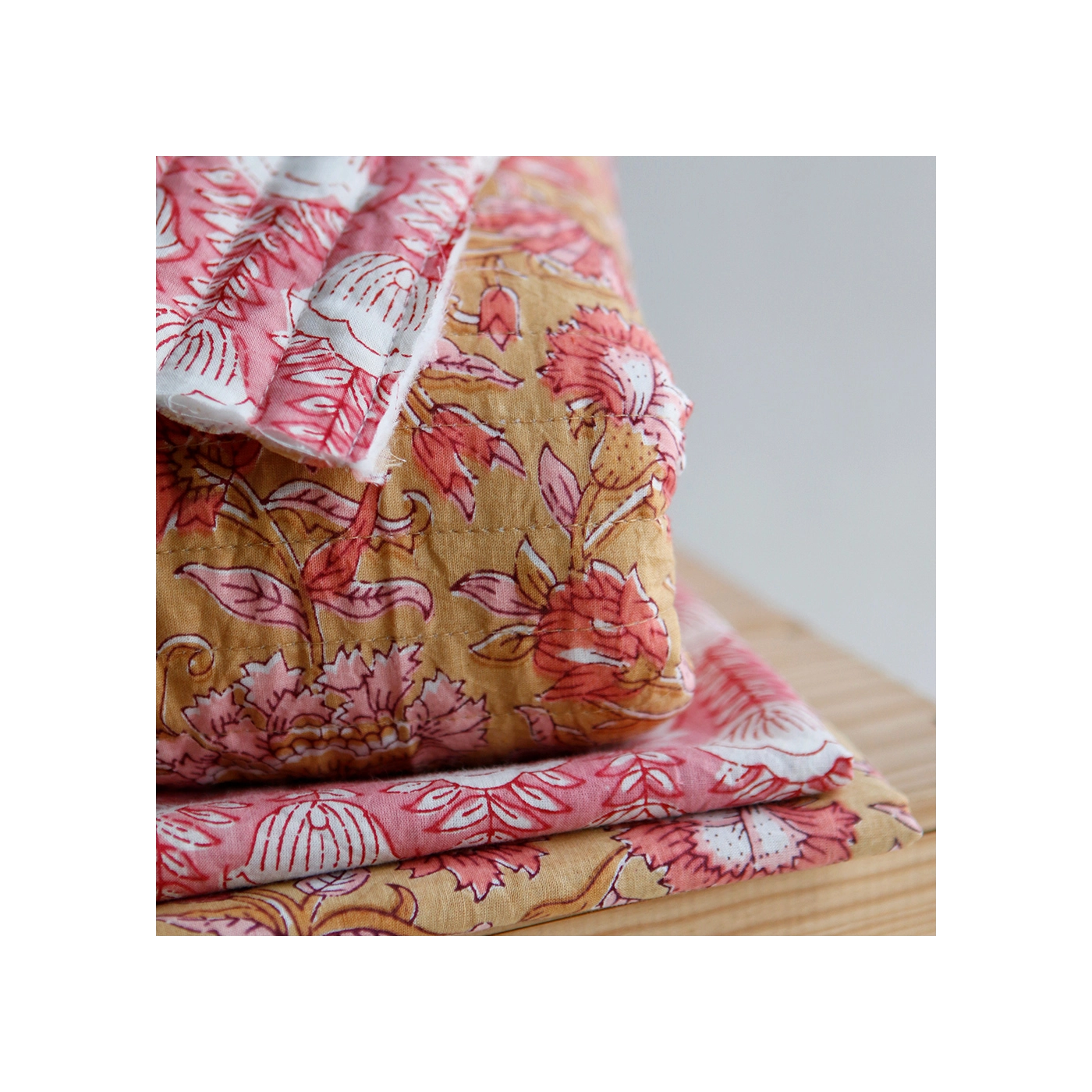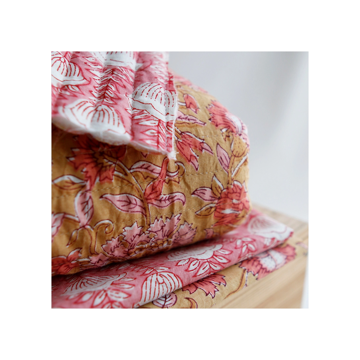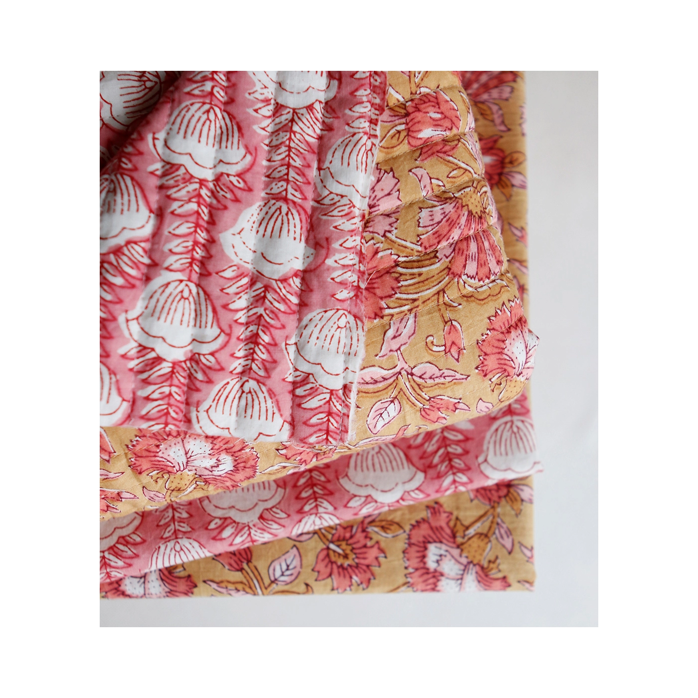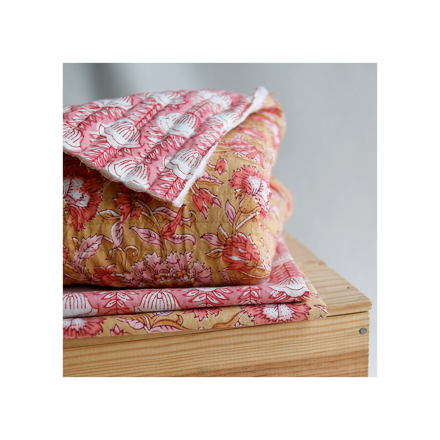 A noter que le processus artisanal (impression à la main, au tampon en bois) de ce tissu fait que chaque pièce est unique et que l'impression n'est pas aussi parfaite qu'un processus industriel.