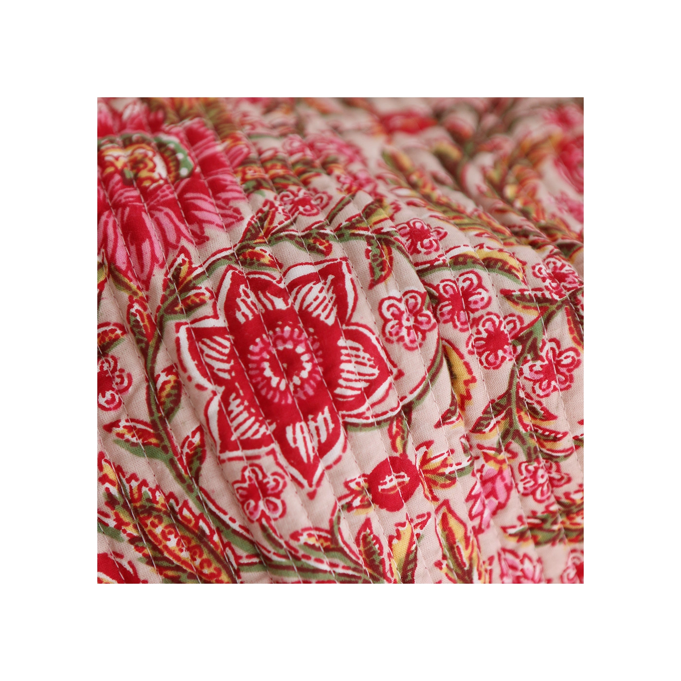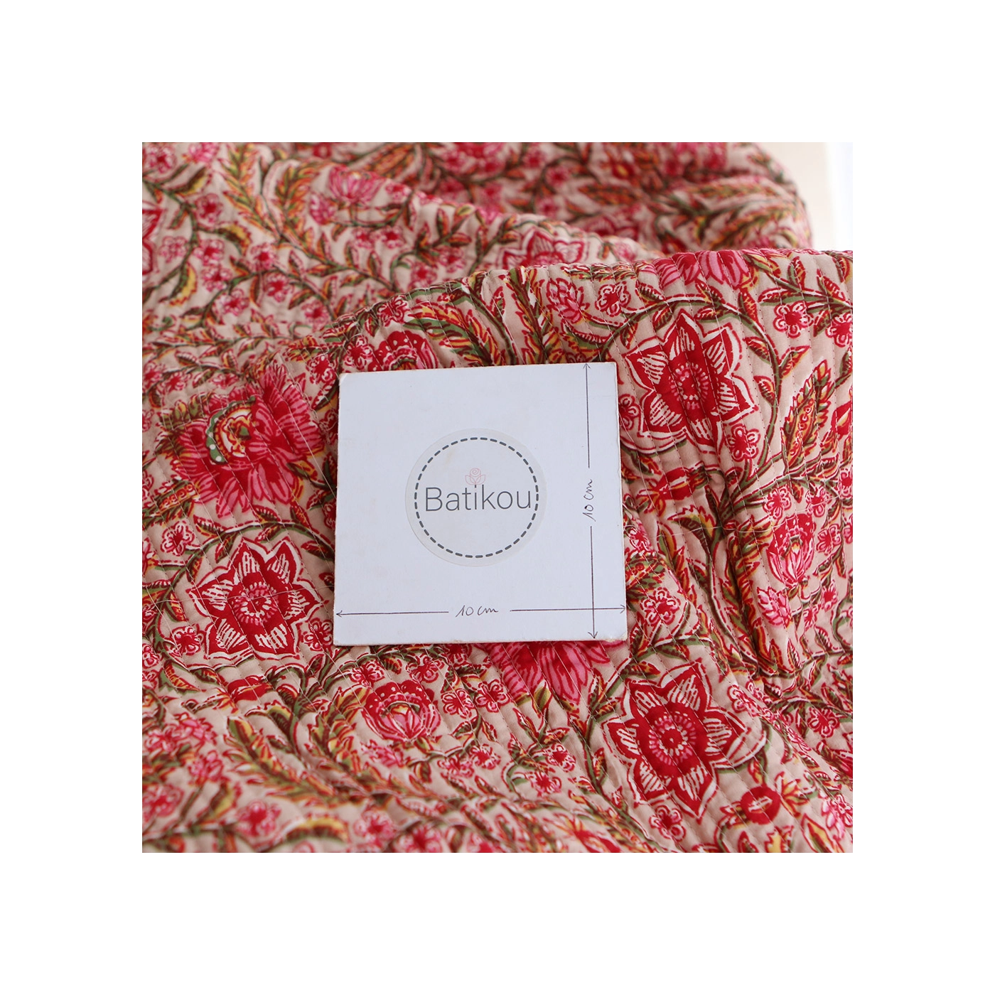 - A noter que le processus artisanal (impression à la main, au tampon en bois) de ce tissu fait que chaque pièce est unique et que l'impression ET le matelassage ne sont pas aussi parfaits qu'un processus industriel.
