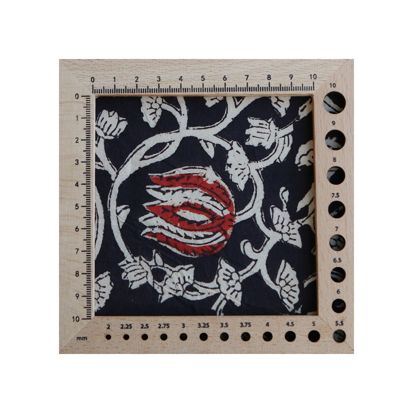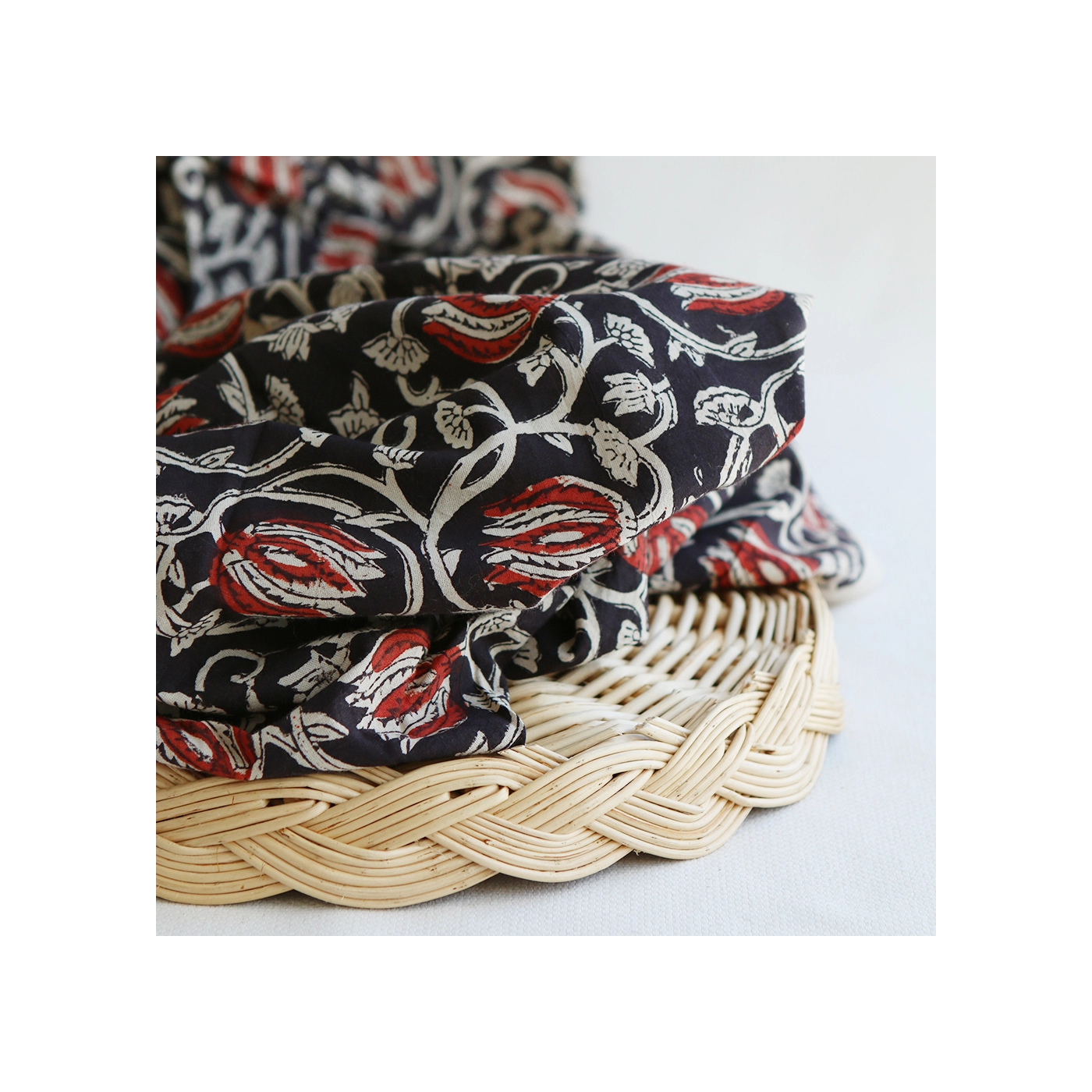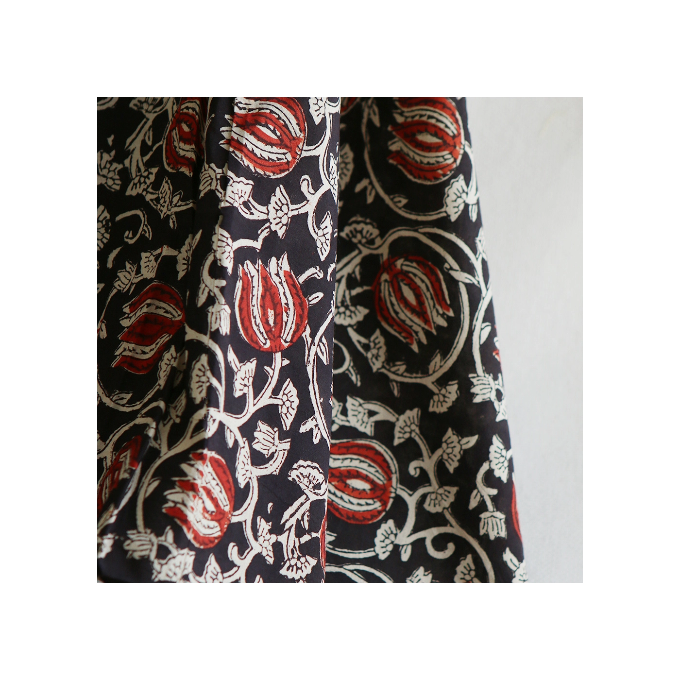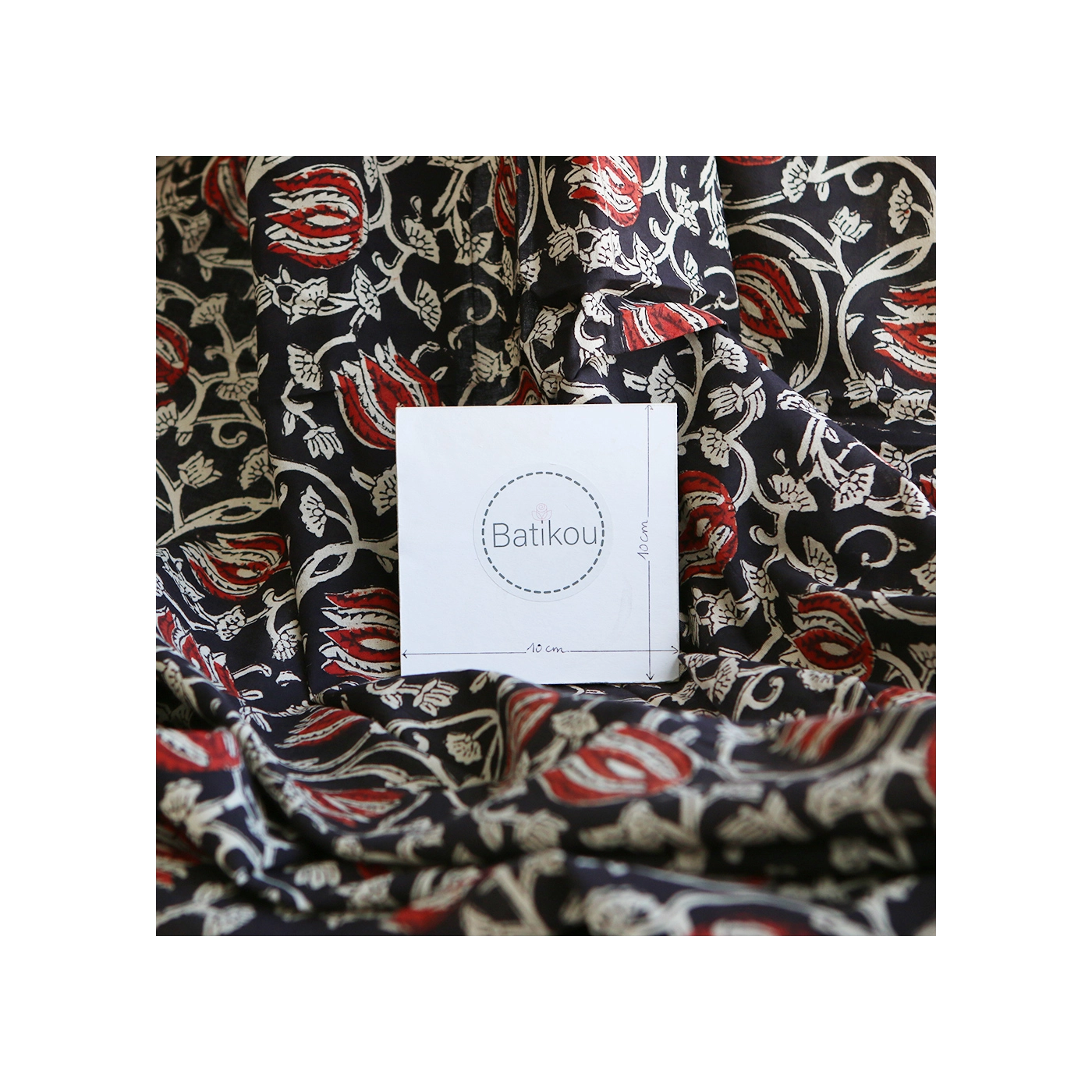 A noter que le processus artisanal (impression à la main, au tampon en bois) de ce tissu fait que chaque pièce est unique et que l'impression n'est pas aussi parfaite qu'un processus industriel.