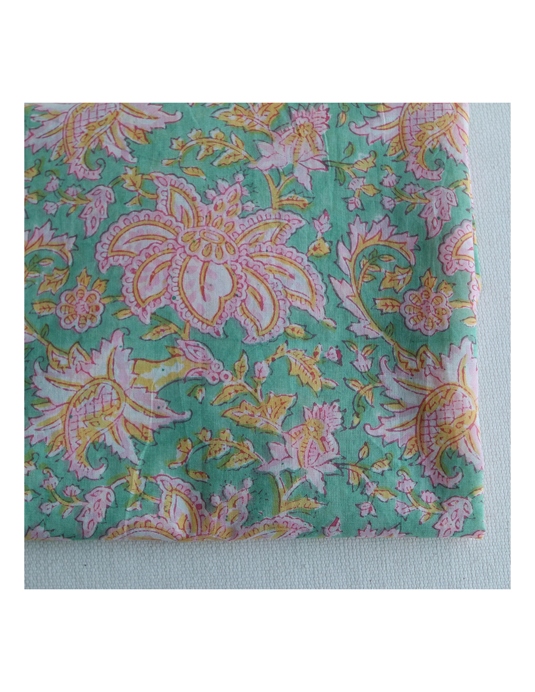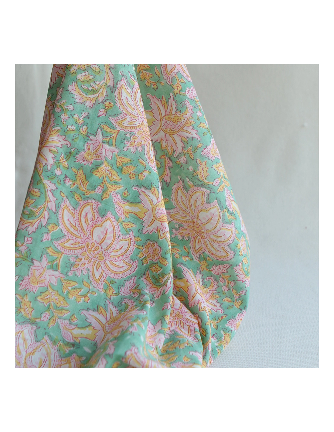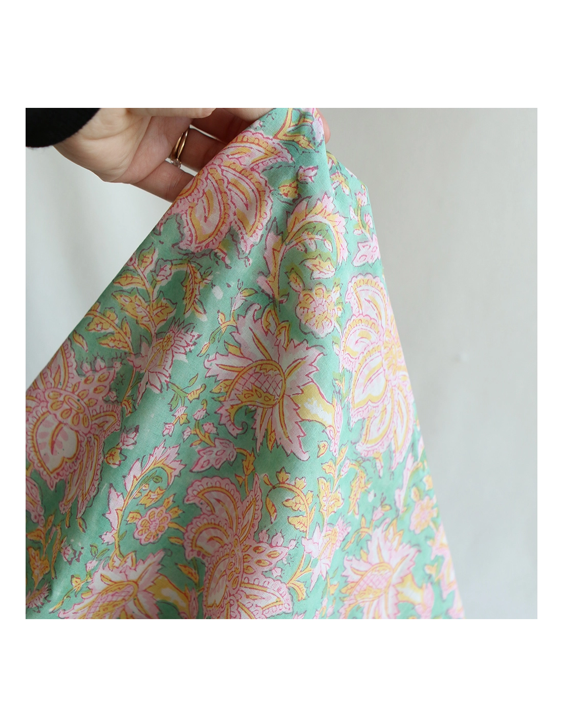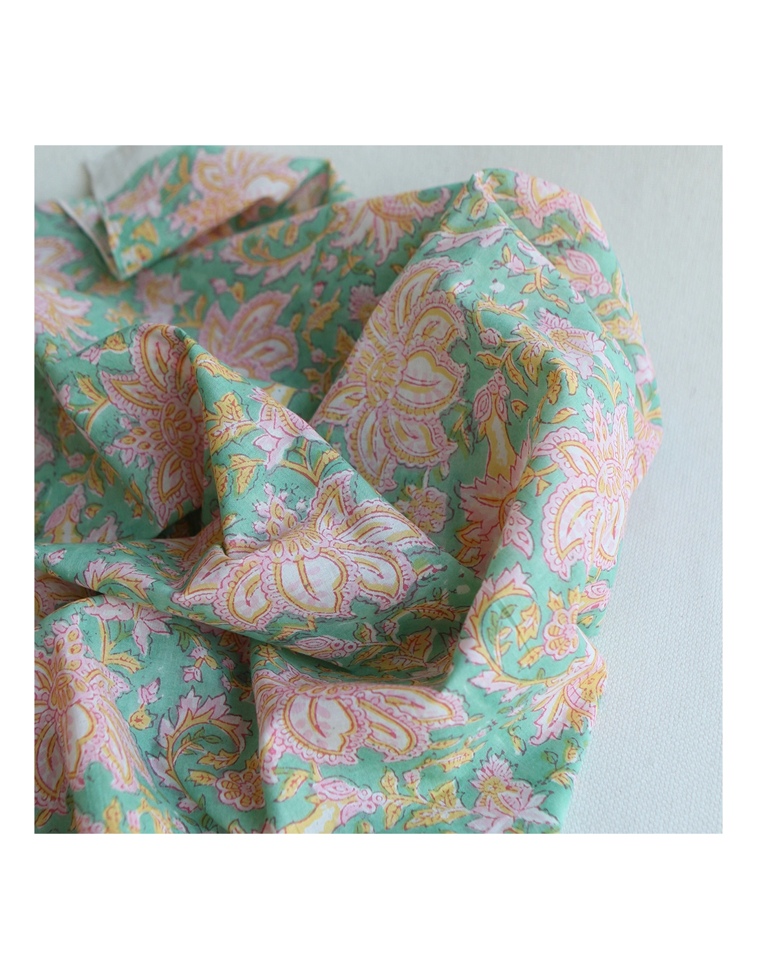 Le block print est un artisanat ancestral indien : le dessin est gravé sur un tampon en bois, chaque couleur nécessitant une étape d'impression distincte.