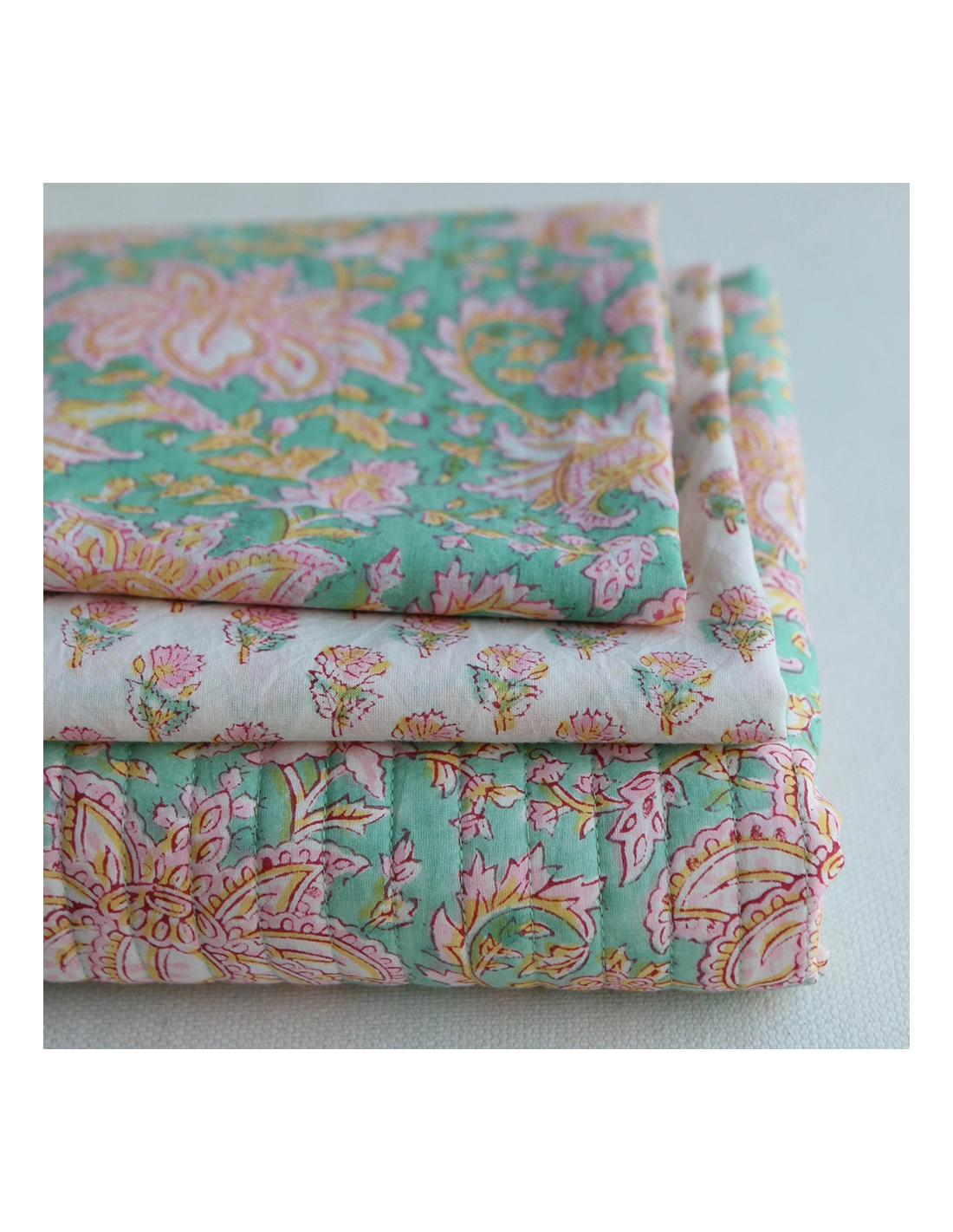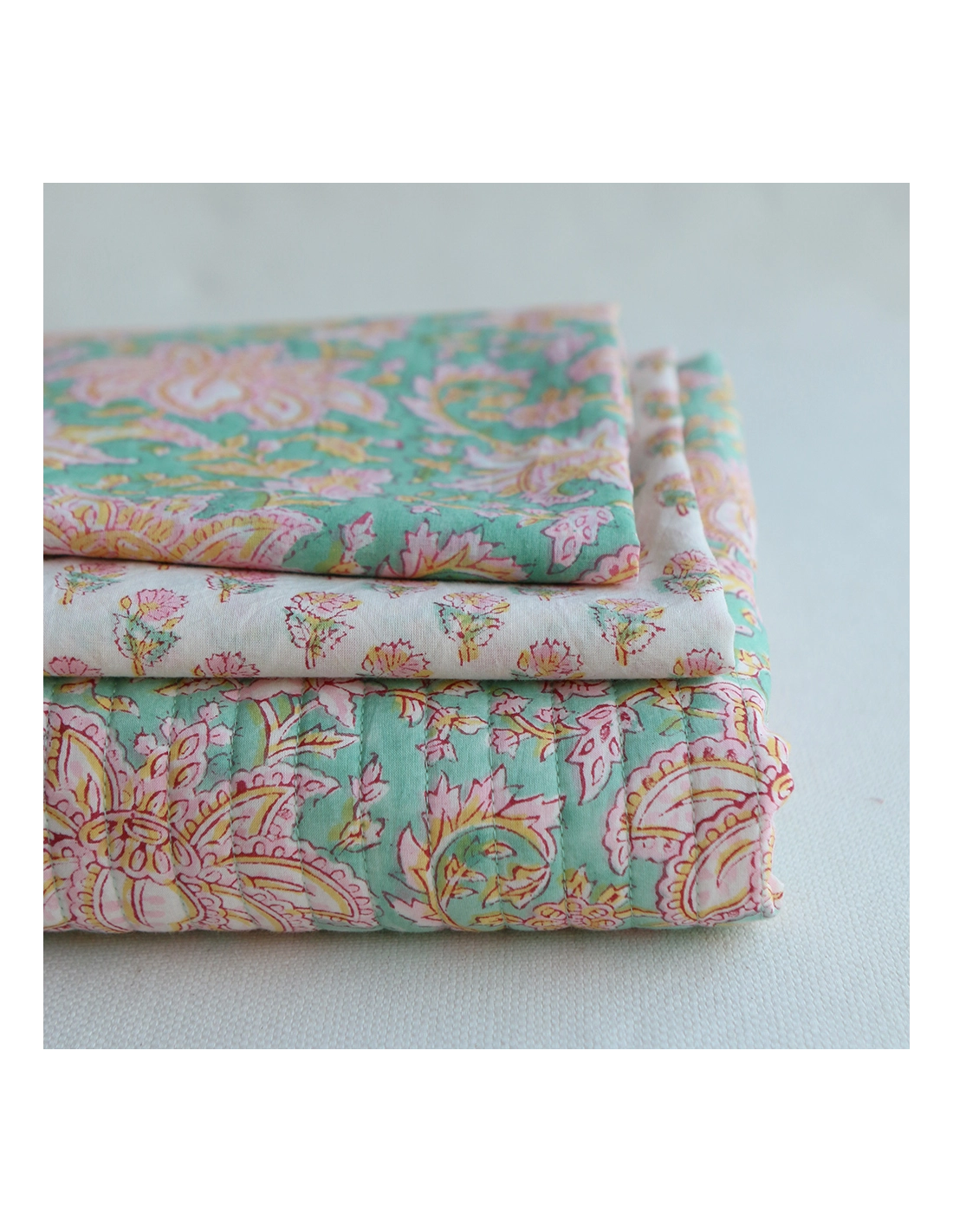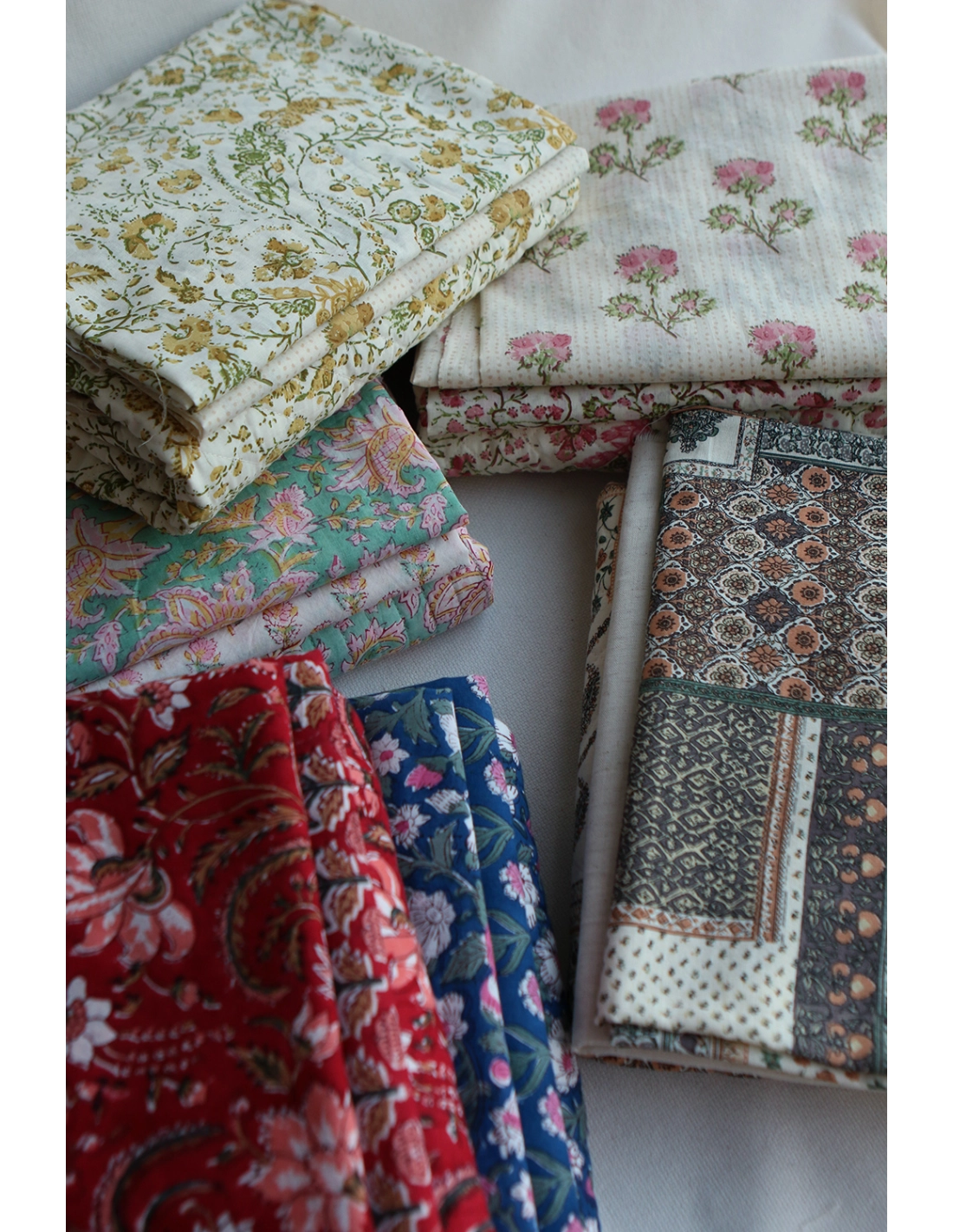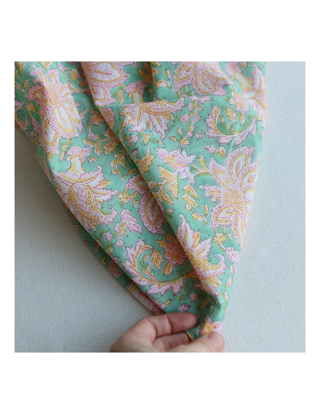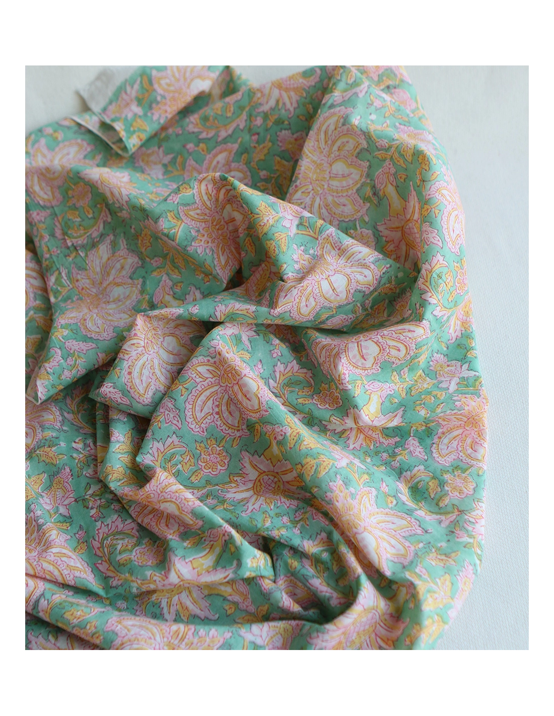 Le block print est un artisanat ancestral indien : le dessin est gravé sur un tampon en bois, chaque couleur nécessitant une étape d'impression distincte.