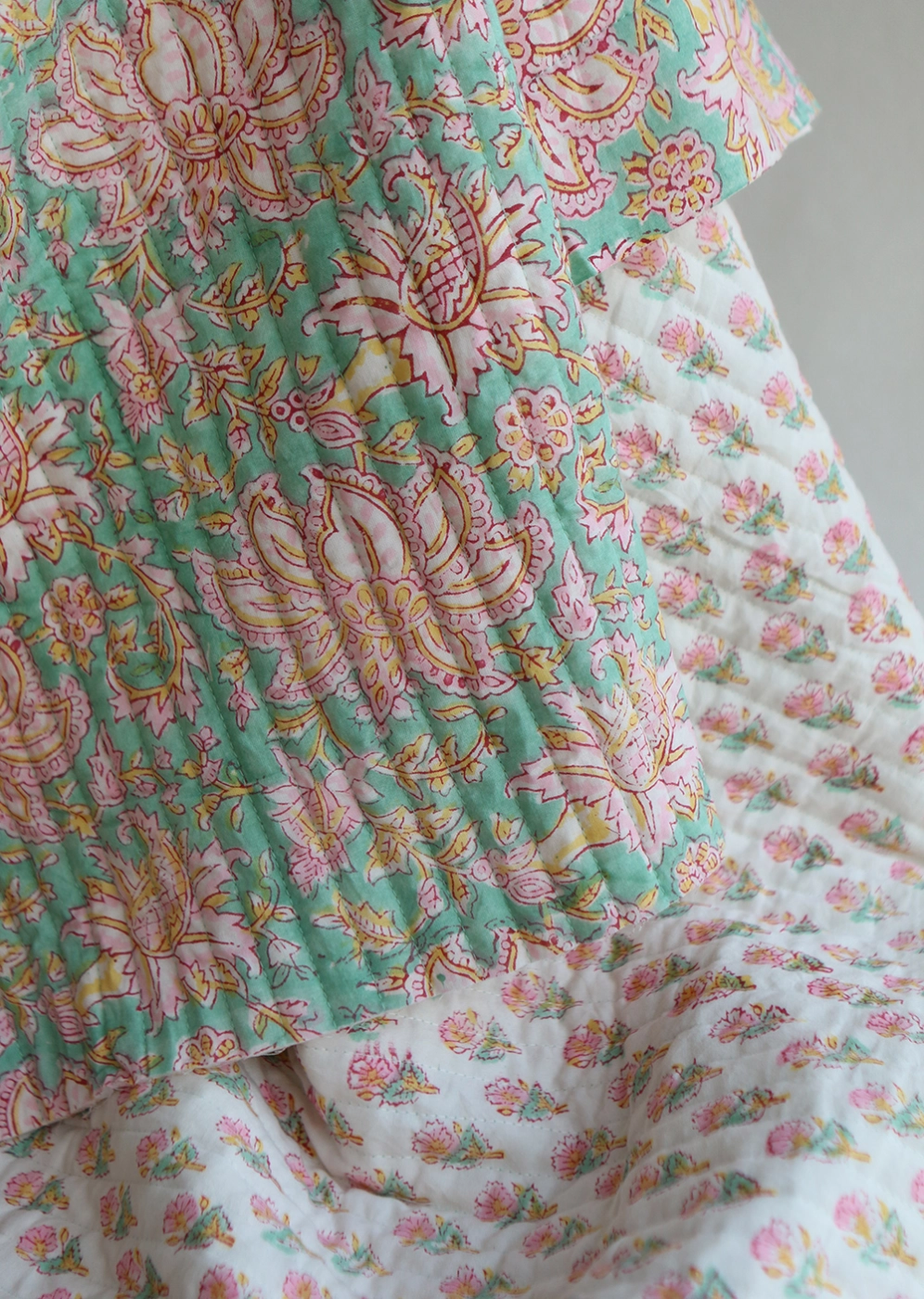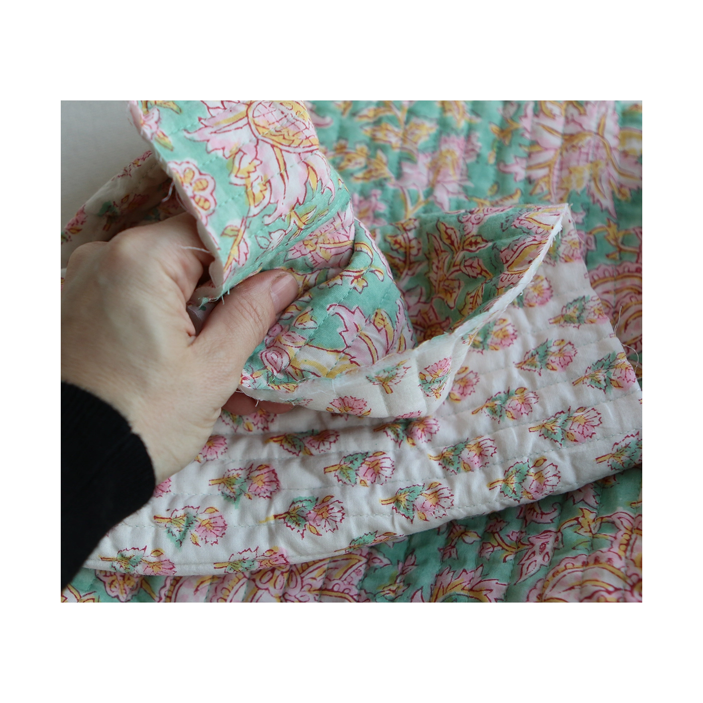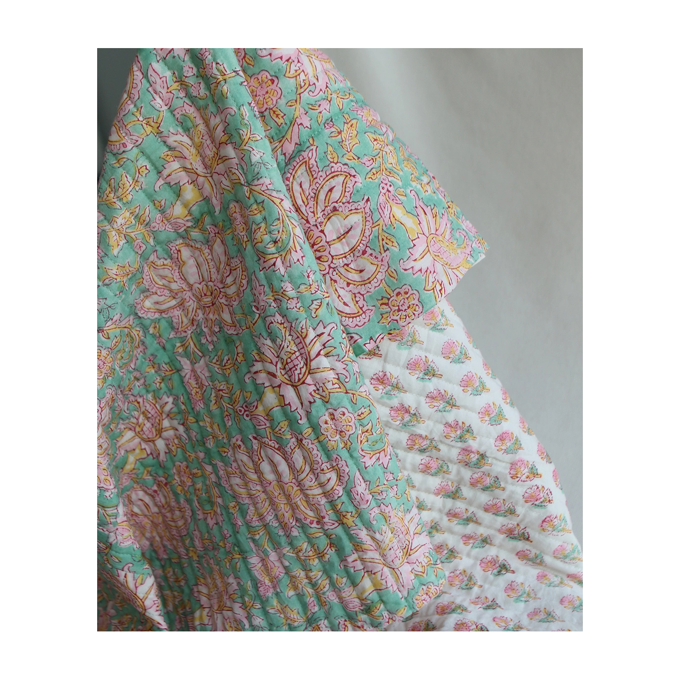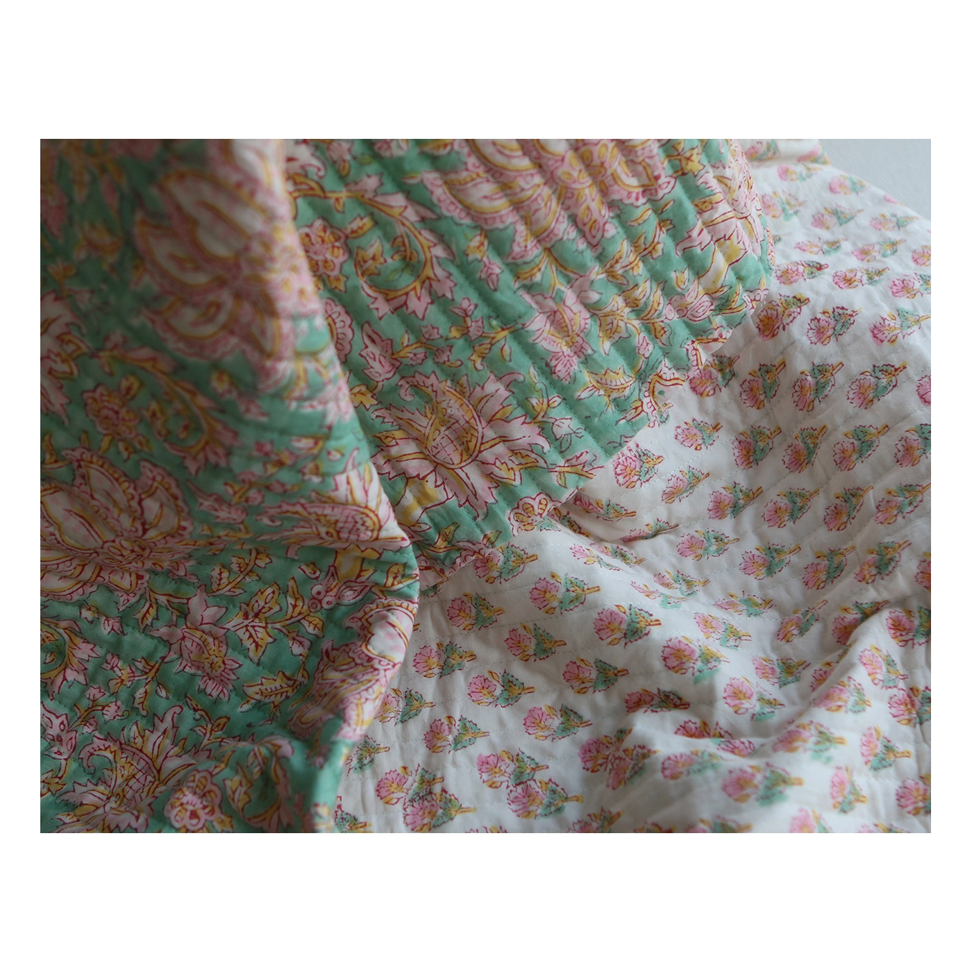 Nous avons décliné cette collection avec nos partenaires en Inde, afin de vous proposer pour le même motif le tissu en coton, et la version double face matelassée.