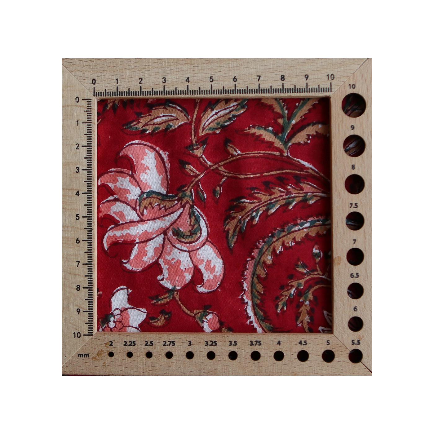 Les couleurs et les motifs apparaissent petit à petit en trempant le tampon en bois dans l'encre textile, puis en le frappant sur le tissu, répétant ce geste autant de fois que nécessaire pour remplir le coupon.