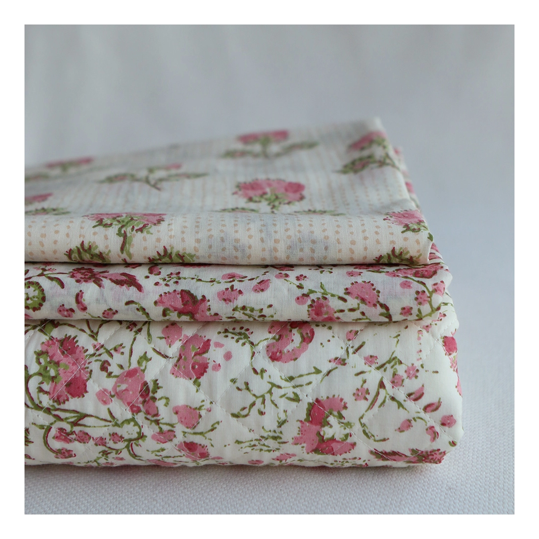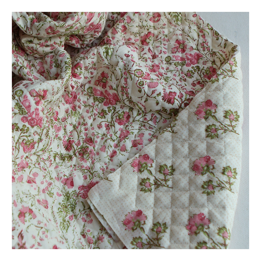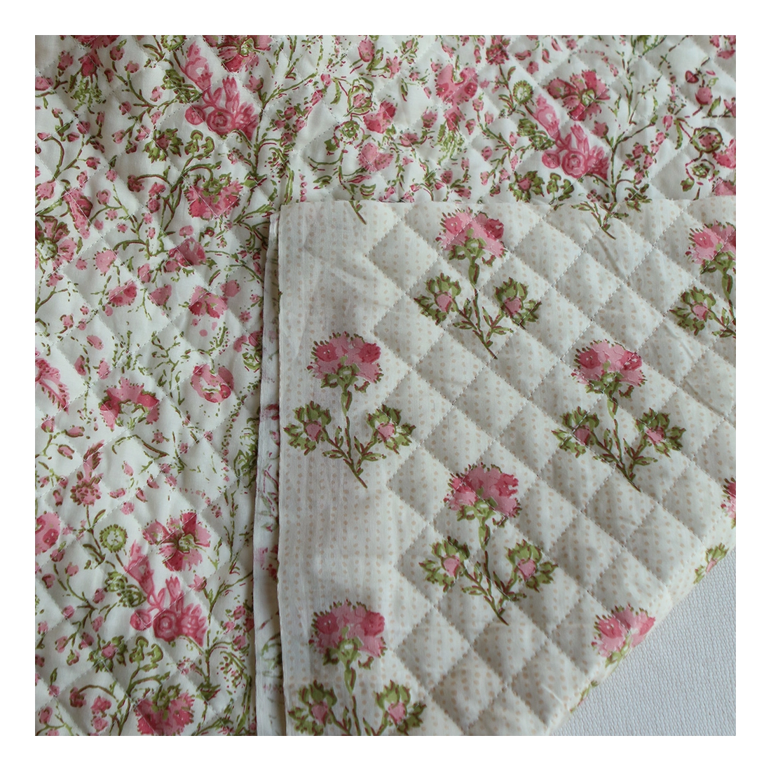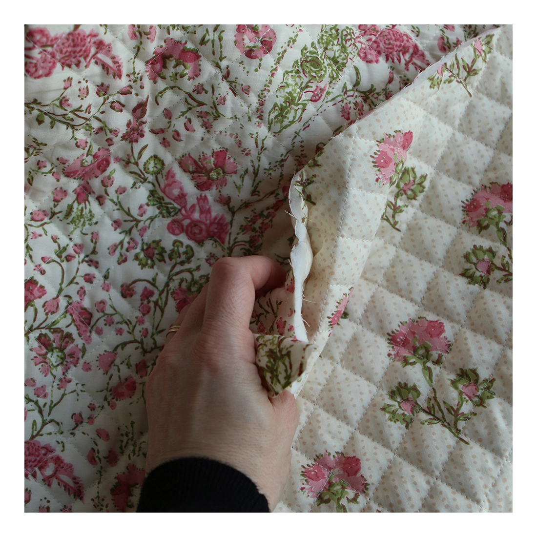 Nous avons décliné cette collection avec nos partenaires en Inde, afin de vous proposer pour le même motif le tissu en coton, et la version double face matelassée.