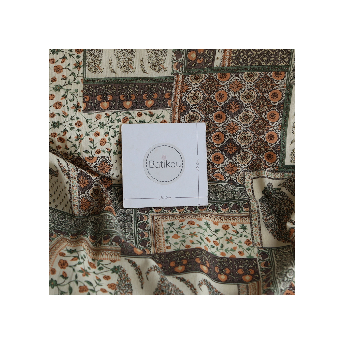 A noter que le processus artisanal (impression à la main, au tampon en bois) de ce tissu fait que chaque pièce est unique et que l'impression n'est pas aussi parfaite qu'un processus industriel.
