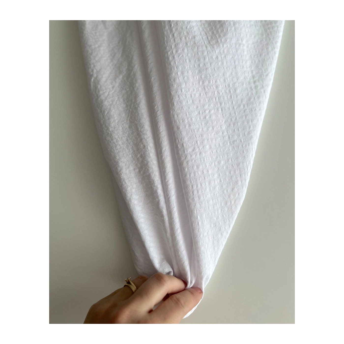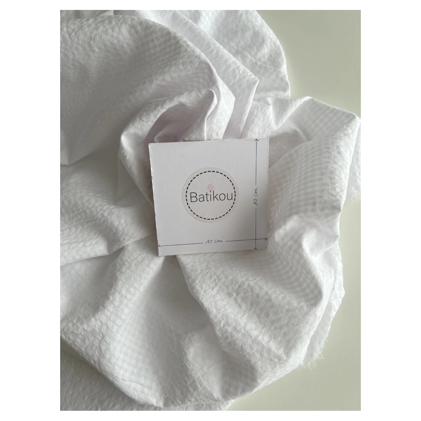 La photo avec le carré blanc permet d'avoir un repère de mesure (le carré fait 10cm de côté) et de couleur, en effet il est blanc optique. Cette indication peut vous permettre de mieux percevoir le rendu du tissu.