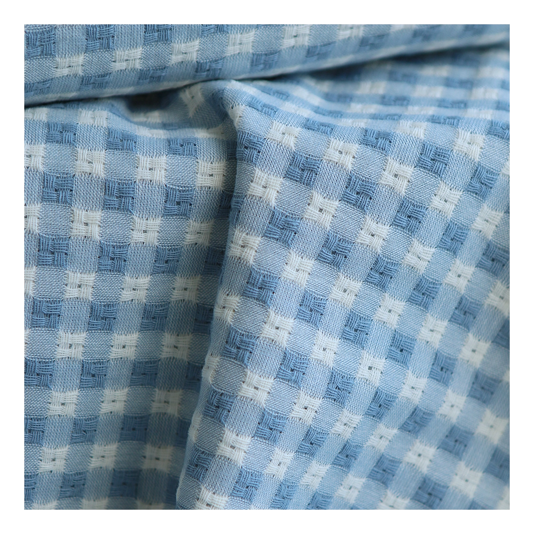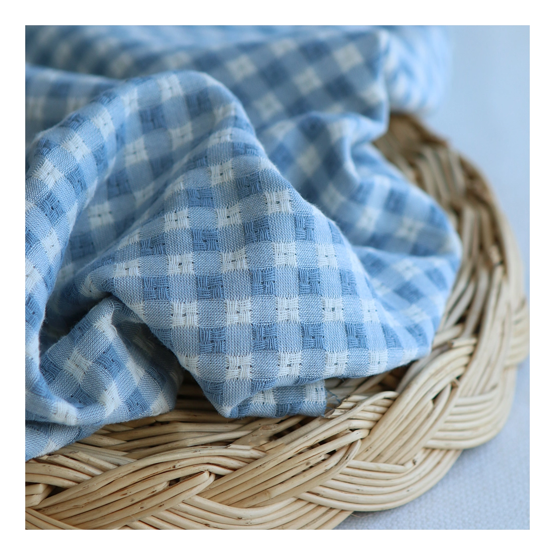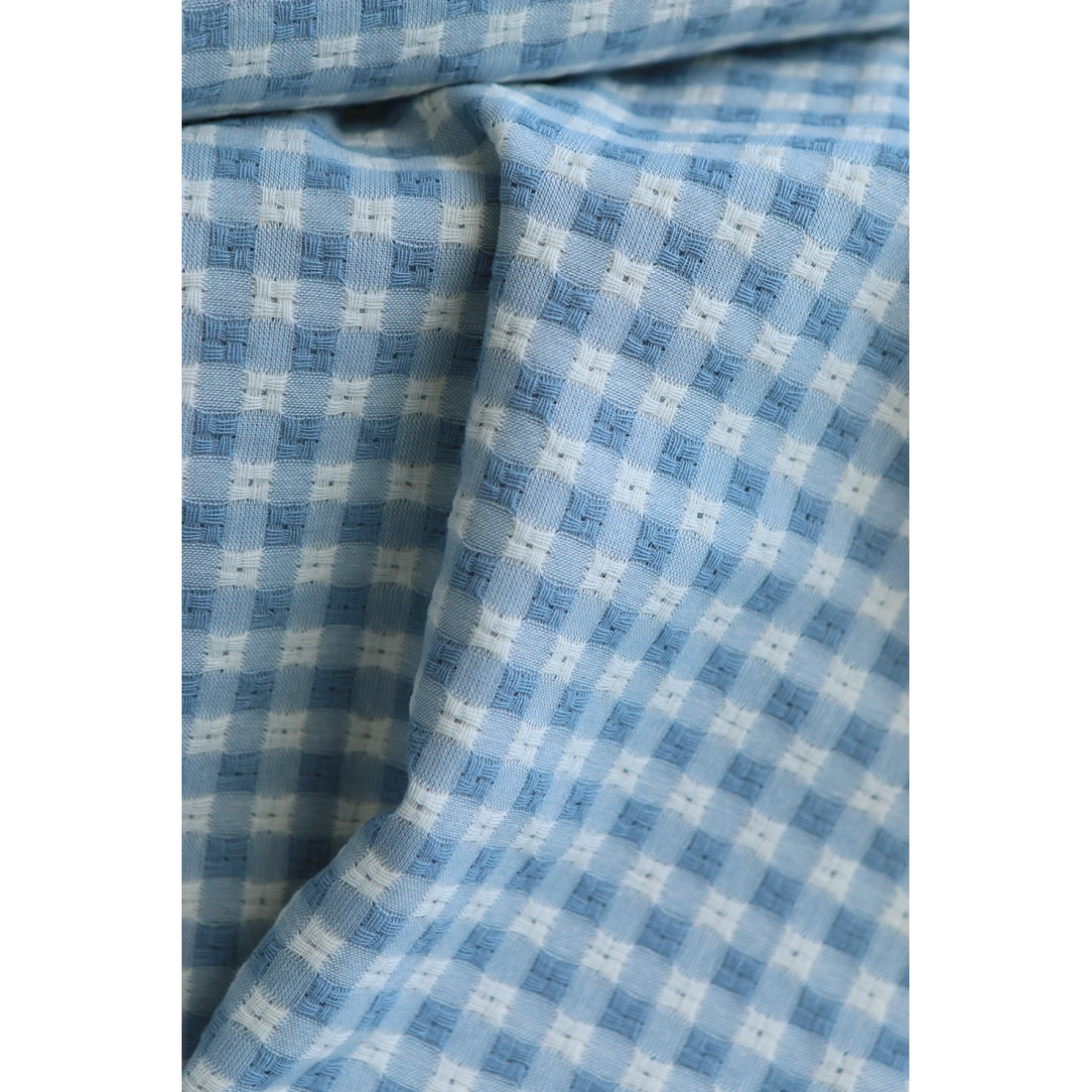 Dick - Seersucker / Coton gaufré texturé vichy 7mm écru et bleu jean tendre