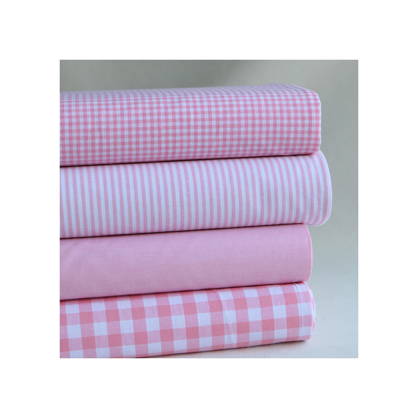 Nous déclinons cette gamme en divers coloris assortis : vichy à carreaux 10mm, vichy à carreaux 2,7mm, rayures 3mm et uni chiné effet chambray.